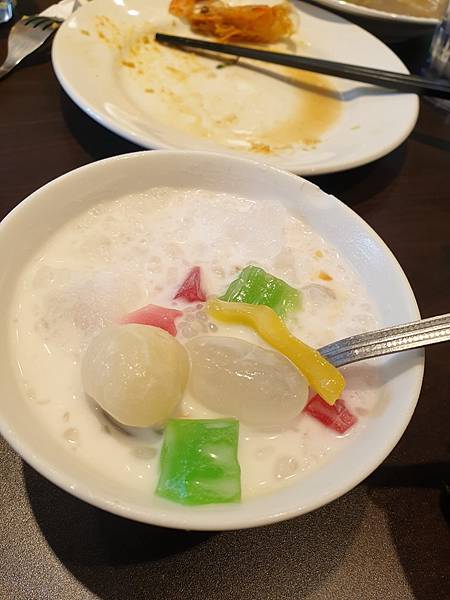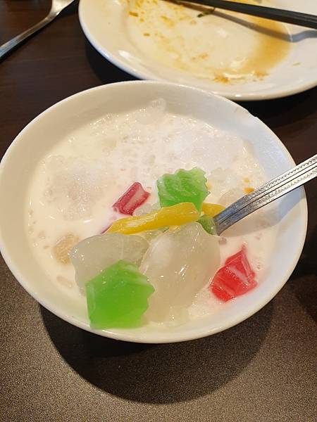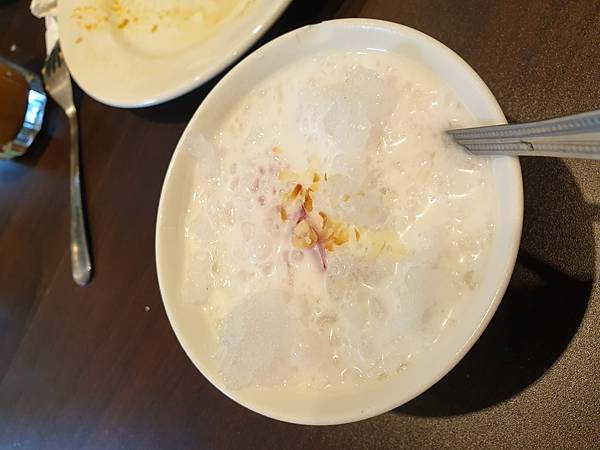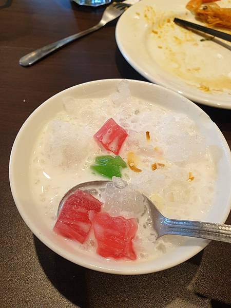 有椰奶、西米露,綠色紅色的像是蒟蒻還是果凍的小點心,也會加入一些南洋風味水果,像是荔枝、亞達枳...難免也會吃到幾片椰子
