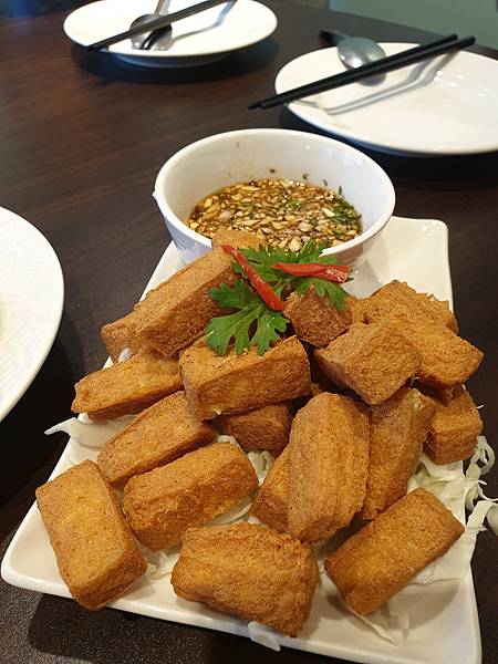 他們的豆腐是酥炸雞蛋豆腐,旁邊的是店家特製的椒麻醬,但也是一點都不辣