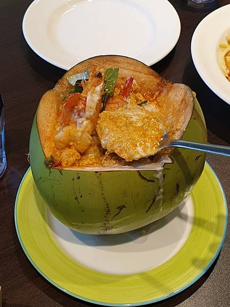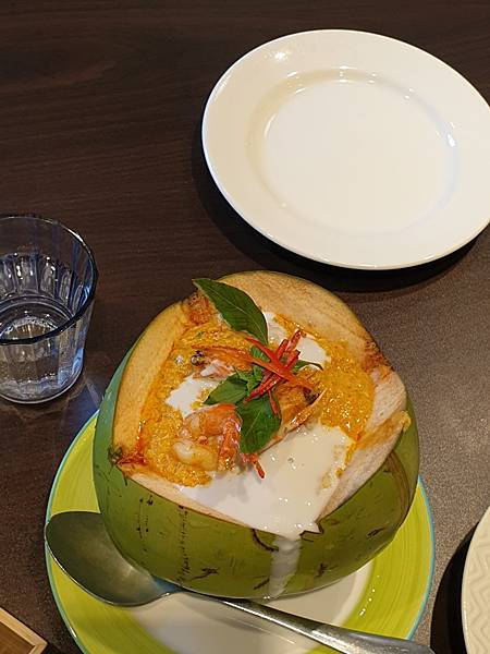 整顆椰子為盛裝的容器,兩隻蝦子躺在最頂部,有紅色和綠色點綴裝飾,真的也是種視覺上的饗宴![]()