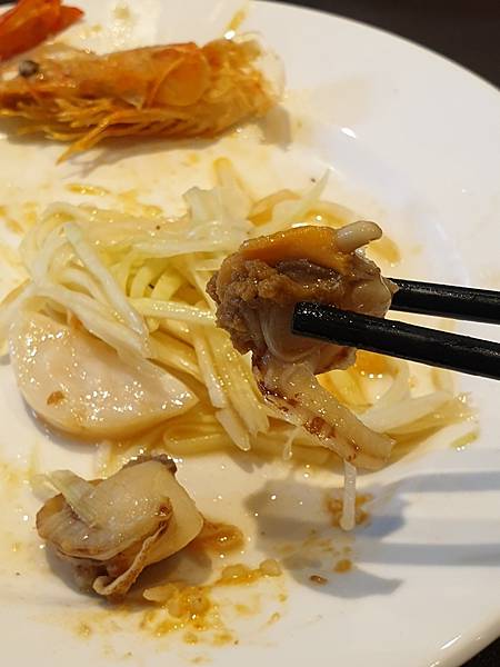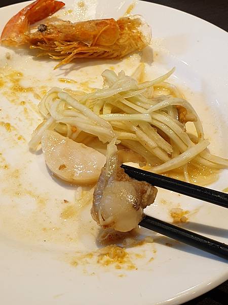 上面躺著兩隻蝦,下面有花枝,番茄、貝類......而那一條條的是涼拌木瓜絲,不說我還以為這間餐廳有賣麵呢![]()