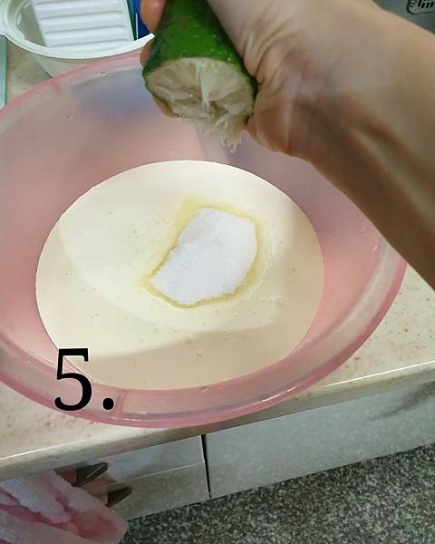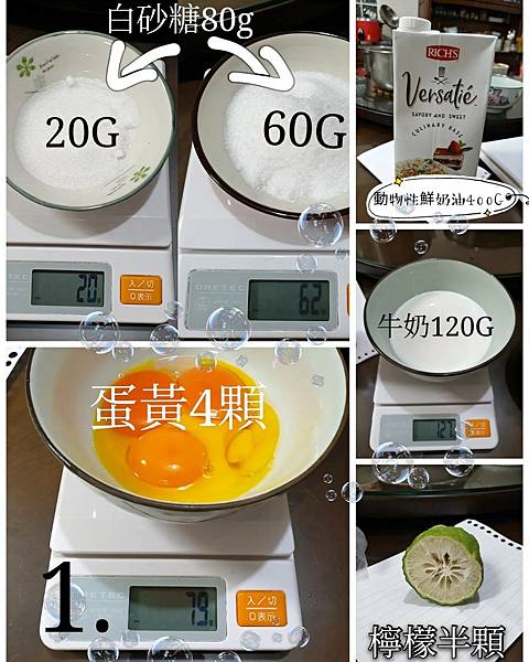 備料:白砂糖80G(分成20G、60G)、蛋黃4顆、動物性鮮奶油400G、牛奶120G、檸檬半顆