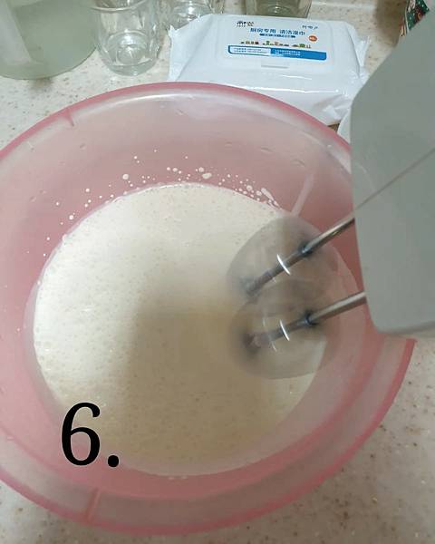 所謂的打發,就是讓它體積變大、顏色變淺,打蛋器提起後會不易滴落具有流動性